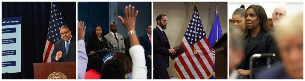 Alvin Bragg is centered in the image, with 2016 voting polls on the left, and Trump's indictment and checks used to lay off Michael Cohen on the right