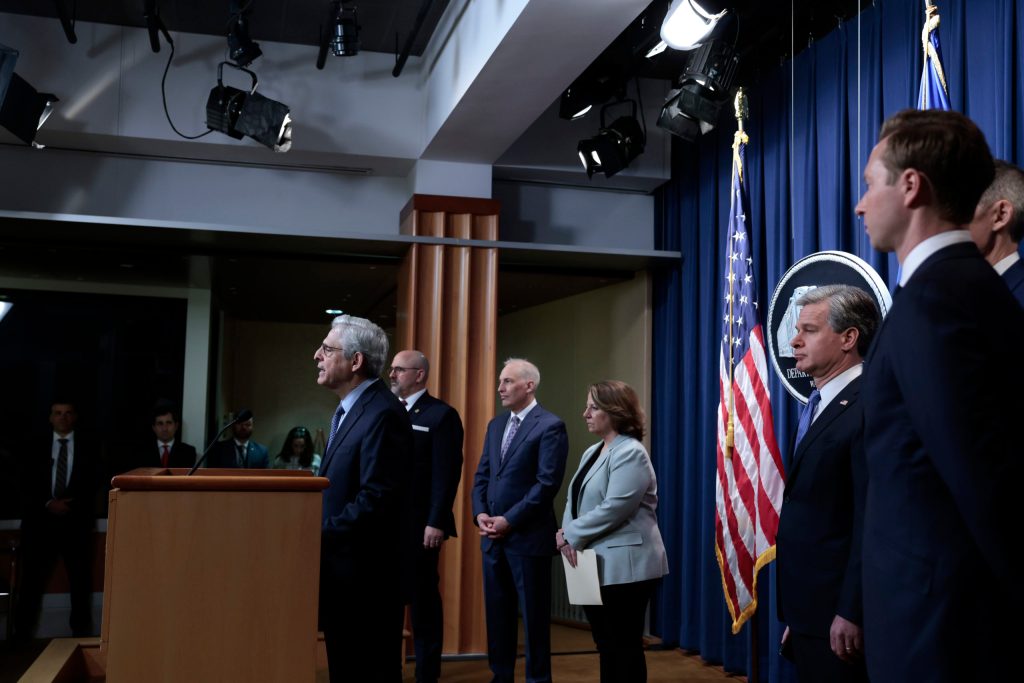 U.S. President Joe Biden stands at a podium and announces new economic sanctions against the Russia government from the East Room of the White House on April 15, 2021 in Washington, DC. A chandelier-type lamp and multiple flags stand behind him.