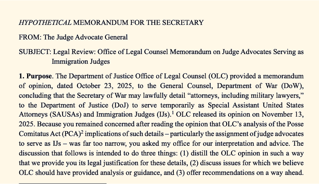A hypothetical legal review examining the OLC's legal basis for having Judge Advocates serve as immigration judges.